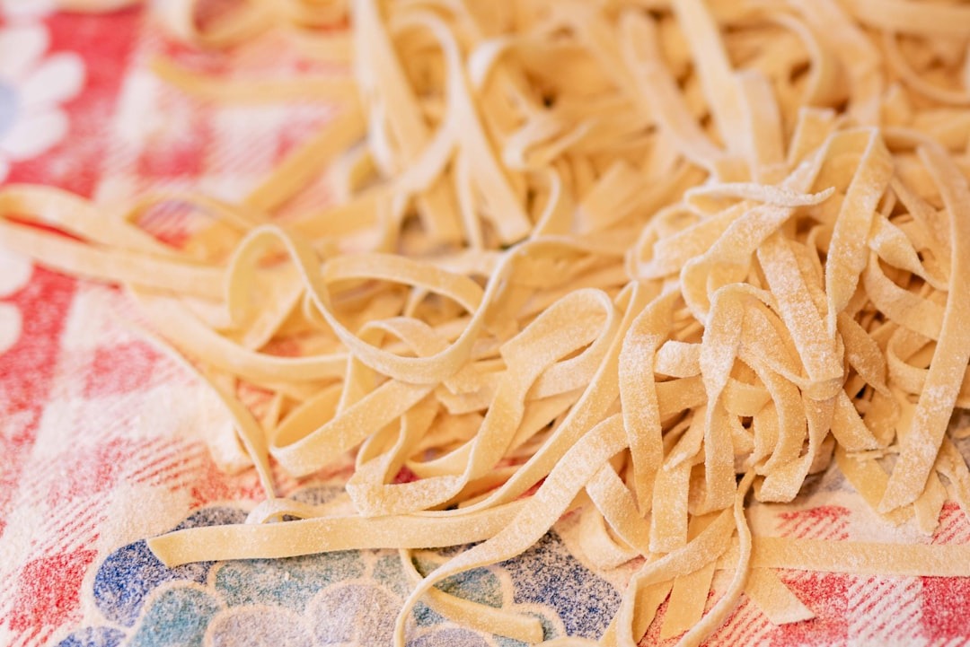 Tagliatelle pasta m. kyllinge strimler, cremet flødesovs, broccoli, gulerødder, champignon & parmesan ost