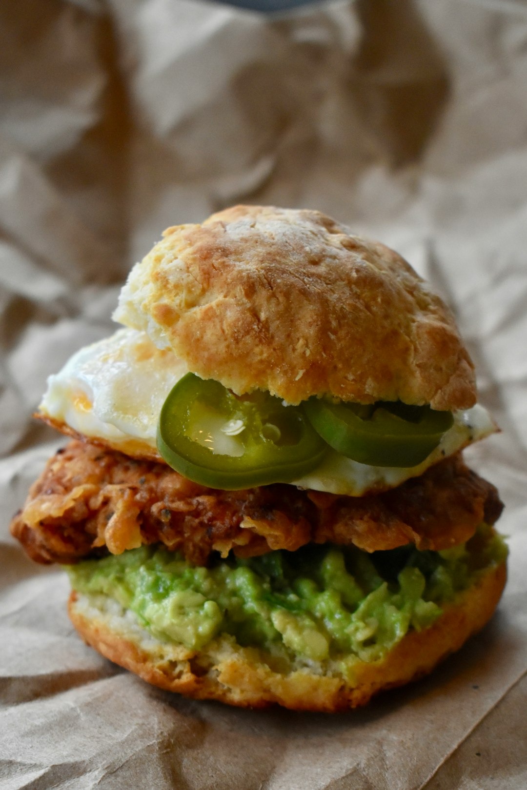 2 stk crispy chicken, lollo bionda salat, frisk tomat, rødløg & chilimayo.